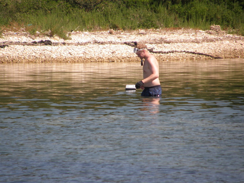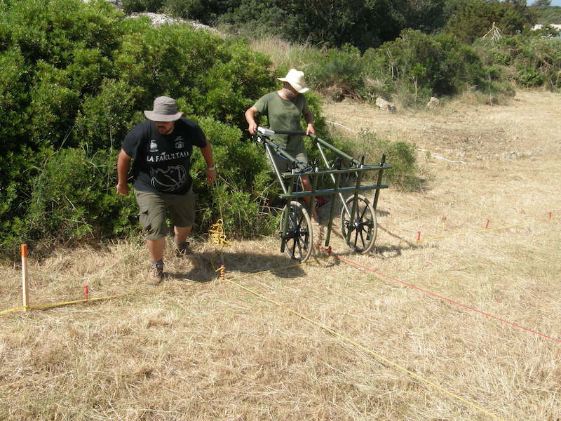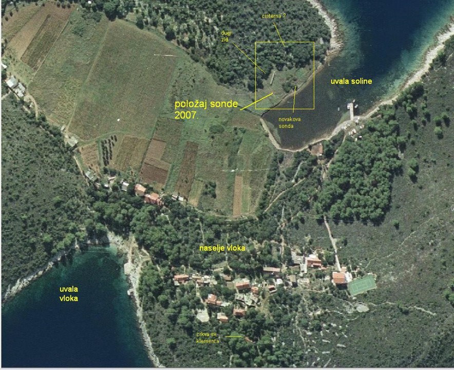 As in the previous campaigns, the fourth season of research during June of 2010 was limited to non-invasive methods and small, targeted test trenches. At the start, the tall grass had to be cut and several areas of the site, previously unexplored, were cleared of vegetation. Dr. Felix Teichner, archaeologist from the Goethe University in Frankfurt, and Dr. Jesus Ignacio Jimenez Chaparro, archaeologist from the University of Oviedo, Spain, surveyed the site using a Total Station. They set up a site grid and created a topographical plan of all visible architectural remains and test trenches. All the special data was geo-referenced to the topographical system of Croatia. They also conducted a magnetometric survey over the total area of 1050 square meters, including the area surveyed in 2007. The results confirmed the previous analysis and showed a complex layout of structures underground with evidence of multi-period occupation and at least two phases of building. The majority of the visible architecture, oriented in the north-south direction, belonged to late antiquity. The magnetometry revealed another architectural complex, oriented NW-SE, which apparently ran diagonally under the standing «long wall» (wall B) and should belong to an earlier phase (the Early Empire?). There was another structure of a different orientation and close to the present shoreline. The German Archaeological Institute supported the work of Drs. Teichner and Chaparro.