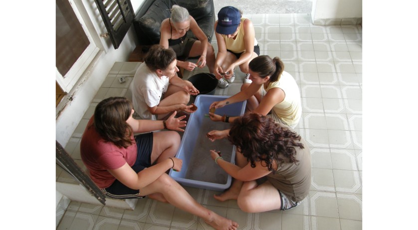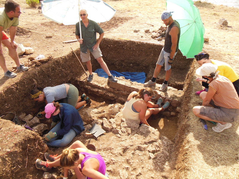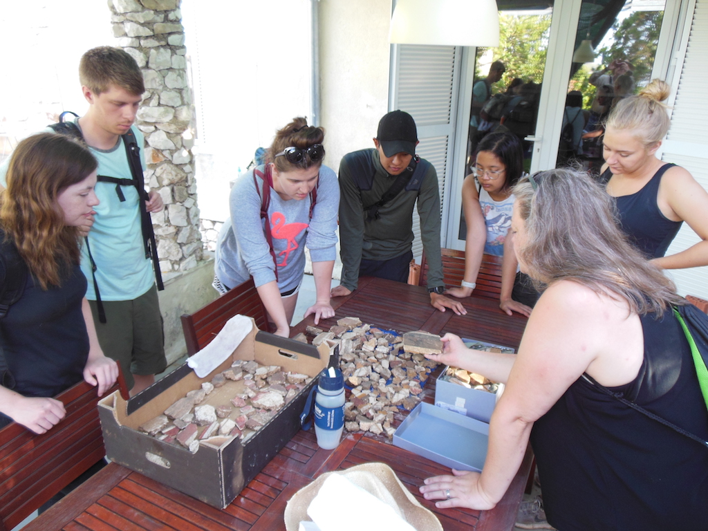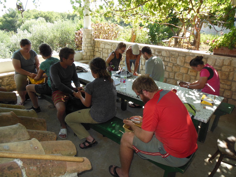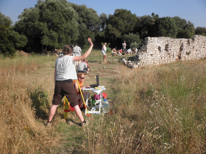 In the fifth campaign of the Soline Project from June 14-30, we continued our interdisciplinary exploration and international collaboration of documenting the topography of the site and the chronology of building and settlement. An Austrian team led by Dr. Tina Neuhauser, Karl-Franzes University, Graz, with her two students, Florian Dinius and Silvia Zenz, collaborated on the project and undertook digital survey of all visible architectural features (standing and uncovered in test probes) with a Total Station. Dr. Branimir Šegvić, a geologist at the University of Darmstadt, Germany, conducted a geological survey and collected samples of clay, soil and stone at the site and at selected locations on the island (quarry in Taršće Bay, lime kiln in Soline Bay). He also took samples of lime mortar from the standing and excavated walls and floors.