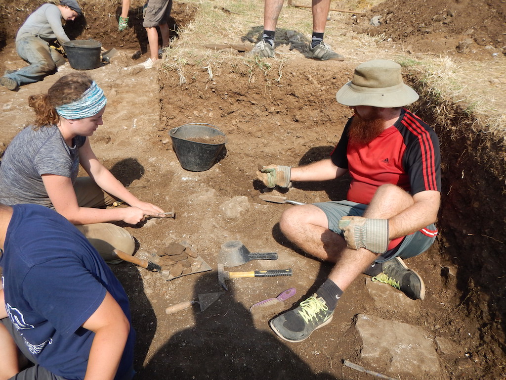 In the ninth season of the collaborative investigations we continued excavating in the production area of the villa, and expanded and connected some previously excavated trenches. Probes 15 and 16 uncovered segments of the architectural features previously documented in Probes 2, 9, 11 and 14, which were excavated in 2010, 2012, 2013 and 2014 respectively. The middle section of an E-W wall, found in Probes 2 and 9 that abutted wall B, was confirmed in Probe 15. This wall ended in the joint with the N-S wall uncovered already in Probe 14. Only the foundations of these walls were found at 0.60 m (2 Roman feet) wide and constructed of roughly cut stones, set in lime mortar. These walls seemed to be the west and south perimeter walls of the production area. A layer of collapsed wall and roof material with evidence of burning was documented north of the E-W wall. It contained numerous fragments of wall plaster, some with polychrome painting in red, yellow and black.